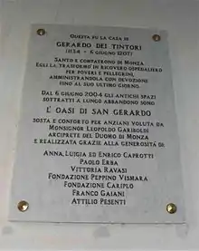 After the death of his father, Gerardo used his inheritance to found a hospital for the aid of the poor and sick.[1] The hospital was apparently established in Gerardo's own house, which stood on the left bank of the River Lambro, near the bridge now called "San Gerardino" and the church of the same name.