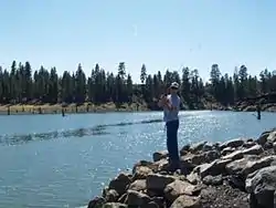 In the forest around the reservoir, there are black-billed magpies, common ravens, Brewer's blackbirds, northern flickers, rock doves, and mourning doves as well as downy woodpecker. Several owl species are found near the reservoir. These include the great horned owl, great grey owl, barn owl, and screech owl. Other bird species common to the area are Steller's jay, pinyon jay, scrub jay, American robin, hermit thrush, western bluebird, mountain bluebird, western meadowlark, horned lark, Cassin's finch, sagebrush sparrow, lark sparrows cedar waxwing, brown creeper, mountain chickadee, dark-eyed junco, red-breasted nuthatch, yellow-rumped warblers, red crossbill, northern oriole, green-tailed towhee, Lazuli bunting, plain titmouse, purple martin, cliff swallow, rock wren, Hammond's flycatcher, American dusky flycatcher, western kingbird, brown-headed cowbird, pine siskin, sage thrasher, and two hummingbird species. The reservoir also attracts birds of prey including prairie falcon, northern goshawk, Cooper's hawk, red-tailed hawk, turkey vulture, osprey, golden eagle, and bald eagles.[2][15][16]