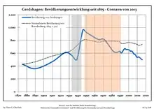 Development of Population since 1875 within the Current Boundaries (Blue Line: Population; Dotted Line: Comparison to Population Development of Brandenburg state; Grey Background: Time of Nazi rule; Red Background: Time of Communist rule)