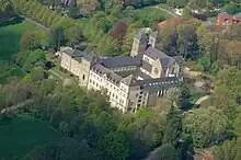 The monks were distributed among various ecclesiastical houses throughout Germany. Two Fathers were deported to the Dachau concentration camp. Twenty-five Gerlever monks were conscripted, eight of whom died in the war, with another two listed as missing. The National Socialists used the Ludgerirast house for the Hitler Youth, and the monastery as a maternity facility. More than 800 children were born in Gerleve. In February 1945, the Wehrmacht set up a military hospital in the monastery, which the Americans took over after the liberation. There is a graveyard in the abbey grounds, where among others, there are buried Russian prisoners of war and deceased patients from the military hospital which occupied the premises.[1]