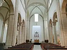 Ludger Wilhelm Rincklake OSB (1851 – 1927) designed the plans for the new monastery and its church. The foundation stone for the neo-Romaneaque church was laid in 1901. The typanum above the church portal, created by Bro. Tutilo Haas, was added in 1939. In 1949, the image of St. Joseph above the high altar was replaced with a mosaic of Christ by Ludwig Baur. In 1954, Baur provided a mosaic of the Annunciation for the Lady chapel.