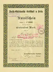 The German East Africa Company (German: Deutsch-Ostafrikanische Gesellschaft, abbreviated DOAG) was a chartered colonial organization which brought about the establishment of German East Africa, a territory which eventually comprised the areas of modern Tanzania, Burundi, and Rwanda. The company originated in 1884 as the Gesellschaft für deutsche Kolonisation (Society for German Colonisation) with the aim of trading in Africa. The German protectorate of Wituland (within modern Kenya) originated as a separate German sphere of influence in 1885. In April of the same year, the company leased the coastal strip opposite Zanzibar from Sultan Khalifa bin Said for 50 years. Its attempt to take over the administration led to a general revolt along the coast of what is now Tanzania. The company could only hold Dar es Salaam and Bagamoyo with the help of the German navy. In 1889 it had to request the assistance of the German government to put down the rebellion. In 1891, after it became apparent that the company could not handle its dominions, it sold out to the German government, which began to rule German East Africa directly. The company initially continued to operate its many activities, including mines, plantations, railways, banking, minting, etc., before it consented to relinquish them to the German colonial administration and other organizations. It subsequently operated as a land company within the German territory[1] until Britain occupied German East Africa during World War I.
