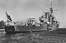 After returning to Germany, Königsberg resumed her gunnery training duties, and also served as a testbed for radar prototypes. She was scheduled to be transferred to the U-boat School, where she would be used as a target ship for U-boat crews. This duty was interrupted by the outbreak of World War II in September 1939.[6] One day before the German invasion of Poland, on 31 August, Königsberg spotted the Polish destroyers Burza and Błyskawica in the Baltic.[7] At the start of hostilities, she and several other German cruisers laid a defensive minefield in the North Sea. She then went into the Baltic Sea for training maneuvers. Kurt-Caesar Hoffmann served as the ship's captain from June to September 1939. In late 1939, a degaussing coil was installed on the ship's hull. Königsberg returned to active duty in March 1940, when she was assigned to the invasion force for the attack on Norway.[8]