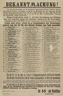 On October 28, 1942, the Supreme Commander of SS and the Police in the General Government SS-Obergruppenführer Friedrich Wilhelm Krüger (HSSPF "Ost") issued a regulation on the creation of so-called remnant ghettos in selected cities of Lublin and Warsaw districts.[16] On November 10, 1942, a similar decree was issued for the districts of Kraków, Radom and Galicia.[19] In § 3 of these regulations, the threat of the death penalty is repeated for people providing shelter or food to Jews who hide outside the designated housing districts. At the same time, unspecified police sanctions (sicherheitspolizeiliche Maßnahmen) were announced against people who do not inform the occupation authorities about the known fact of Jewish presence outside the ghetto (in practice, this meant deportation to a concentration camp). At the end of 1942, a similar decree for the Białystok district was announced by gauleiter of East Prussia Erich Koch. Strict penalties for helping Jews were also imposed in the Warta Country.