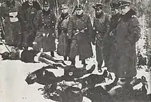 The Germans used Polish Blue Police officers to participate in roundups and Judenjagd (search operations). Some police officers attended to these duties zealously, including participating directly in the murder of Jewish escapees.[1] Polish foresters, members of voluntary fire brigades and members of rural guards also took part in the activities. Moreover, Polish village heads, mayors and civil servants were obliged to enforce German regulations concerning the capture of Jews and preventing them from receiving aid.[2]