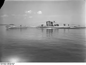 ![]() U-45 conducting speed trials in 1938. Note her number on the conning tower, it was removed at the beginning of the war | |