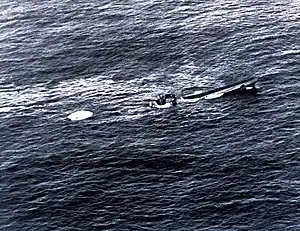 ![]() Sinking of German submarine U-761. U-761’s crew abandons ship after she was crippled by British destroyer and US Navy (VP 63) aircraft attacks in the Strait of Gibraltar. | |