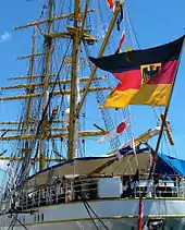 Stern view of Gorch Fock, showing the German naval ensign and the ship's rigging.