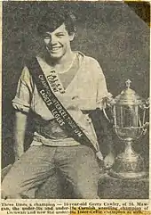 "Three times a champion - 14 year-old Gerry Cawley of St Mawgan, the under-16s and under-18s Cornish Wrestling Champion of Cornwall and now the under-16s Interceltic Champion as well"