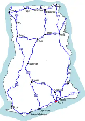 National routes in Ghana are a class of roads and highways that form the trunk routes between major urban centers. Together, they form the backbone of the road system. This category of roads is designated with the letter N followed by a number indicating the specific route.[5] Odd-numbered routes run east to west, while even-numbered routes run north to south.