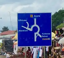 Signage on the Ghana network conforms broadly to international norms. All length distances are shown in kilometers, speed is in kilometers per hour, whilst height and width restrictions are shown in meters. Signs may be of an informative, warning or instructional nature. Instructional signs are generally circular, warnings are triangular, and informative signs are rectangular or square. Informative signs, which include directional signs, use white text on a blue background.