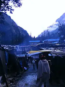 Ghangaria is situated at the confluence of the river Pushpawati, which forms Lakshman Ganga, that later meets the river Alaknanda at Govindghat. It is the last human habitation in the Ghangaria valley. This place is usually used by travelers as a base camp to visit Hemkund Sahib and Valley of flowers.[1] It is only open from June till October. The rest of the year, the valley is covered under snow.