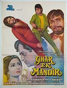 Ghar Ek Mandir (transl. The house is a temple) is a 1984 Indian Hindi-language drama film directed by K.Bapaiah, starring Shashi Kapoor, Mithun Chakraborty, Ranjeeta, Moushumi Chatterjee, Shakti Kapoor, Kader Khan and Raj Kiran. The film was remade in Tamil as Anni starring Mohan and Saritha.