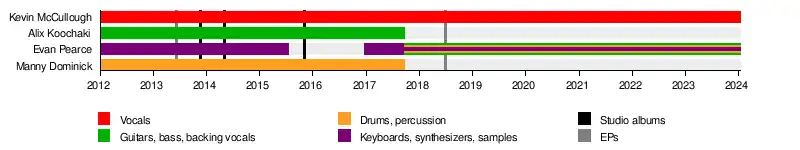 The band is made up of vocalist Kevin "Ghost" McCullough and keyboardist Evan Pearce, who left the band for a short period of time beginning in 2015, just a few weeks before the release of Evolution. He returned late 2016. From the group's foundation in 2012 until 2017 the band also included drummer MannYtheDrummer and guitarist/backing vocalist Alix Koochaki.