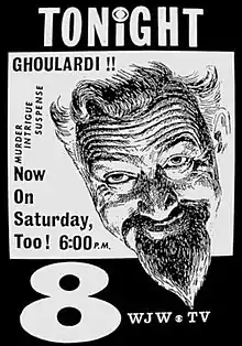 Ghoulardi was a fictional character created and portrayed by voice announcer, actor and disc jockey Ernie Anderson as the horror host of Shock Theater at WJW-TV, Channel 8 (a.k.a. "TV-8") the CBS Affiliate station in Cleveland, Ohio, from January 13, 1963, through December 16, 1966.[1] Shock Theater featured grade-"B" science fiction films and horror films, aired in a Friday late-night time slot. At the peak of Ghoulardi's popularity, the character also hosted the Saturday afternoon Masterpiece Theater, and the weekday children's program Laurel, Ghoulardi and Hardy.