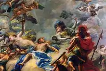 He also worked in Naples, where he painted frescoes for the Palatine chapel in the Royal Palace. He was a contributor to the scenography of the operas Giasone, il Minotauro, and Arianna at the Teatro San Bartolomeo in Naples.[1] He collaborated with Francesco di Maria and Francesco de Mura, in the frescoes for the Palazzo Carafa and the palace of the Prince Caracciolo de Avellino. He painted frescoes in the gallery of the Marquis of Genzano. He also painted frescoes in the Milano Chapel of San Domenico Maggiore and in the church of San Gregorio Armeno. he painted canvases for Church of Santa Maria di Sette Dolori and Santa Teresa degli Scalzi. He also painted in the Basilica of San Antonio and the cathedral in Sorrento. He painted frescoes in the Belvedere palace in Vienna for Eugene of Savoy. He died in Naples in 1726.