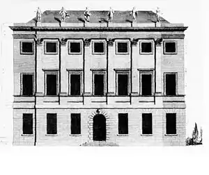 Leoni's first commissions in England, though for high-profile clients the Duke of Kent and James, Earl Stanhope, first lord of the Treasury, remained unexecuted. His first built design in England was Queensberry House, 7 Burlington Gardens, for John Bligh, Lord Clifton, in 1721.[4] This was to be an important architectural landmark, as the first London mansion to be built on a terrace with an "antique temple front."[5]