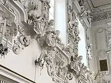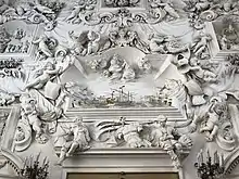 His stucco work for the oratories follows a general formula, but each elaboration is its individual tour de force. Two of the oratories are dedicated to the rosary, and the wall is divided into a series of tableaux or dioramas, each matching a Mystery of the Rosary, above these are allegorical figures or a fecundity of cherubs in playful frolic. The tableux develops a program of prayer images, like a via crucis for contemplative prayer. The Santa Cita oratory is remarkable for its dioramas, coupled with almost genre like figures calling our attention from the moldings on which they perch. Between the doors entering the oratory is a remarkably detailed depiction of a naval battle, referencing the Battle of Lepanto. In the frames above and below are a trophy of arms, including helmets and body armor, and a Hapsburg eagle spreads its wings.