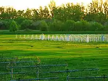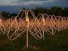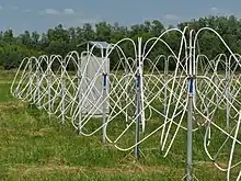 The crossed dipoles are grouped into square 5×5 subarrays.[1][2][3] The subarray design provides a wide frequency coverage from 8 to 80 MHz, high sensitivity (the galactic background level exceeds their self-noise by more than 7 dB), and high RFI immunity (achieved due to high dynamic range of the dipole amplifier: input IP3 is 30 dBm). The effective area at the central frequency is about 350 m².[4]