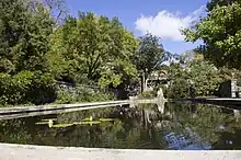 Sharp died in 1968 and the estate was inherited by his son, Hugh Rodney Sharp Jr., who did not share his father's interest in horticulture. By the time he died in 1990 the gardens had not been maintained for many years and were badly overgrown. The estate was put up for sale after his death and was saved from demolition after a campaign by local people and the Preservation Delaware organization.[6] The Delaware Open Space Council bought the development rights to the property and the Sharp family donated the estate to Preservation Delaware.[3] In 1998 the estate was listed on the National Register of Historic Places. The listing included works of art, a house, a horticultural facility, secondary structures, and street furniture/objects. It included five contributing buildings, seven contributing structures and 48 contributing objects.[2] The gardens were opened to the public in 1999.[3] Access is free and is permitted daily between dawn and dusk.[6]