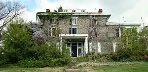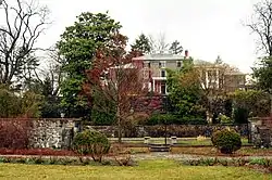 The estate occupies an area equivalent to an entire city block, surrounded by a stone wall standing 6 ft (1.8 m) high with entrances on Pennsylvania Avenue and Greenhill Avenue. Pillars stand at each entrance, topped with stone vases decorated with carved floral ornaments. The mansion sits on an elevation which slopes gently down to the west but drops sharply away to the east, overlooking the gardens.[1]