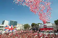 The official Gibraltar National Day events begin with a children’s fancy dress competition held at the lobby of the Parliament building in Main Street followed by a street party at John Mackintosh Square where food and drink stalls are set up providing Gibraltarian food such as calentita. Later a selected school choir sings songs with a Gibraltar theme, namely Llévame Donde Nací and Virgencita de Europa. This is followed by the main event, the Mayor's recitation of the names of the recipients of the Gibraltar Medallion of Honour and the reading of the Gibraltar National Day Declaration from atop the City Hall's balcony. This was previously followed by the traditional release from atop the Parliament building of 30,000 red and white balloons, representing Gibraltar's population, which had featured on this day since 1992.[1] The balloon release tradition has been ended in 2016 due to the threat that it poses to wildlife, marine wildlife in particular.[4] In the meantime, the school choir leads the general public in the singing of the Gibraltar Anthem.[5]