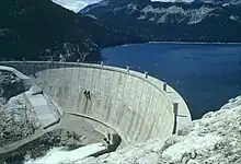The dam is a 199 ft (61 m) high and 960 ft (290 m) long arch gravity structure, with a base thickness of 115 ft (35 m) tapering to 15 ft (4.6 m) at the crest. As a whole the dam contains about 167,500 cu yd (128,100 m3) of concrete.[1] The impounded water forms Gibson Reservoir, which can store up to 96,477 acre⋅ft (119,003,000 m3) at full water levels of 4,724 ft (1,440 m).[2] When full, the reservoir covers 1,296 acres (524 ha), with a shoreline of roughly 15 mi (24 km) and a maximum depth of 195 ft (59 m).[2][4] Water releases are controlled by two sets of outlets: three release valves at the base of the dam have a combined capacity of 3,050 cu ft/s (86 m3/s), while a gated tunnel spillway, controlled by six 34 ft × 12 ft (10.4 m × 3.7 m) radial gates, can pass a maximum of 30,000 cu ft/s (850 m3/s).[2]