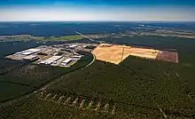 Extending north from the 1-square-kilometre (0.4 sq mi) "GVZ Freienbrink" logistics centre,[65][66][67] the area was an undeveloped 3-square-kilometre (1.2 sq mi) greenfield land site designated industrial zone.[68] It was planned as a location for a BMW car factory around the year 2000, but BMW chose Saxony instead.[69] Much larger pine meadows in a landscape-scale conservation[70] surround Freienbrink and a state-owned man-made forest of low-quality monoculture harvest-ready planted pine[71][72] trees occupied the site, and authorities expected Tesla to mitigate felling by planting new trees of more diverse variety.[73][74][75] 160 hectares of vegetation was cleared for the factory, and by 2022, 265 hectares of new multiple-species forest had been planted elsewhere. The pines are planned to be reforested with additional species.[76]