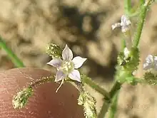This wildflower produces a basal rosette of toothed leaves from which grow one or more erect, multibranched stems. The stems are glandular and are pale green with pinkish or purplish tinting and have a few scattered toothed leaves, especially near branching junctions.