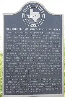 Texas historic marker for Old Riedel Dam in Gillett, Texas