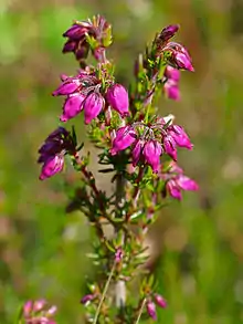 As of 2013 over 200 species of flowering herbs, shrubs, trees (angiosperms), coniferous trees (gymnosperms); and rushes (Juncus) and sedges (Carex) have been inventoried on Gillies Hill.[7] The first flowers to appear on Gillies Hill after the cold of winter are the snowdrops which surround the ruined Fir Park Cottage. In May the forest floor along Old Drove Road is carpeted with English bluebells. These bluebells, Hyacinthoides non-scripta, are commonly confused with the Scottish bluebell or harebell, Campanula rotundifolia, which blooms throughout the summer, is lighter blue in color and is usually found in the higher reaches of Gillies Hill.