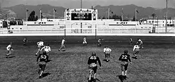 It was the home of the Los Angeles Bulldogs, the first professional football team in Los Angeles.[2] The Bulldogs competed as an independent team before joining the second American Football League in 1937 and winning its championship with a perfect 8–0–0 record, the first professional football team to win its championship with an unblemished record.[3] After the collapse of the league, the Bulldogs returned to being an independent team before joining the American Professional Football Association in 1939.[3] The Bulldogs then became charter members of the Pacific Coast Professional Football League in 1940[4] and played in Gilmore Stadium until 1948, when the team moved to Long Beach, California, for its (and the league's) final season.