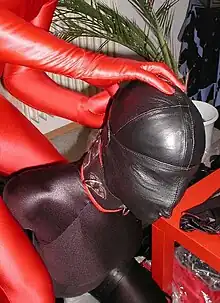 A bondage hood (also called a gimp mask or bondage mask) is a fetishistic hood.[1][2] It may be made from rubber, latex, PVC, spandex, darlexx or leather. Full-faced hoods are typically used for the practice of head bondage, and to restrain and objectify the wearer through depersonalization,[3] disorientation and/or sensory deprivation.[2]
