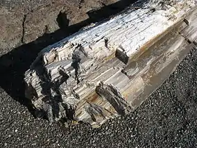 The strata the park lies in is identified as the Miocene epoch of the Neogene period, around 15.5 million years ago.[3] During the Miocene, the region was lush and wet, home to many plant species now extinct. A number of these trees were buried in volcanic ash, and the organic matter in the tree trunks was gradually replaced by minerals in the groundwater; the resulting petrified wood was protected for millennia by flows of basalt. Near the end of the last ice age, the catastrophic Missoula Floods (about 15,000 BCE) eroded the basalt, exposing some of the petrified wood.