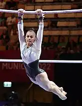 In April Villa was selected to represent Italy at the European Championships in Basel alongside Alice D'Amato, Martina Maggio, and Vanessa Ferrari.[32] During qualifications Villa only competed on the uneven bars and balance beam. Although she fell off the balance beam, she was able to qualify to the uneven bars event final.[33] During the event final she finished in fourth place behind Angelina Melnikova, Vladislava Urazova, and Amelie Morgan.