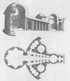 Borromini also knew and used ancient models. Baalbek, Petra, Sabratha and Leptis Magna are the finest examples of the late Imperial architecture in the Eastern Empire admired by Borromini. Some of them have elements almost identical in plan with Borromini’s designs. But he certainly could have not known those buildings, because those ancient monuments were buried under sand till the twentieth century. It is likely that more buildings of this kind existed in or near Rome in the seventeenth century that is now shapeless masses of brickwork. It seems that Borromini relied on drawings of Montano, whose reconstructions of ancient monuments appeared in engraved form between 1624 and 1664 in a series of volumes called Li cinque libri di architettura. The original drawings were in the collection of the Roman collector and antiquarian, Cassiano dal Pozzo. These drawings provide the sources for a number of important motifs, which at first sight would not suggest any connection with ancient architecture. But in details they reproduce monuments that correspond closely to works by Borromini. For instance, there is a striking similarity between the lantern of Borromini’s Sant'Ivo alla Sapienza and the ancient temple of Baalbek, a building Borromini could not have known.[5]