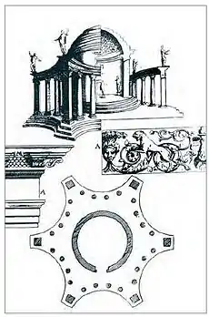 Engraving taken from Montano's drawings depicting the reconstruction of the ancient Roman Temple of Vesta in Tivoli.