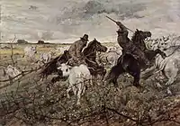 Giovanni Fattori (September 6, 1825 – August 30, 1908) was an Italian artist, one of the leaders of the group known as the Macchiaioli. He was initially a painter of historical themes and military subjects. In his middle years, inspired by the Barbizon school, he became one of the leading Italian plein-airists, painting landscapes, rural scenes, and scenes of military life. After 1884, he devoted much energy to etching.