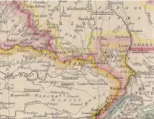 Miani left Amamba and on 29 April 1872 crossed the Gada River, a left tributary of the Uele. On 1 May 1872, he arrived at Nangazizi[lower-alpha 2], the base of chief Mbunza, where he rested until 25 May 1872. From there the expedition crossed the country of the South Zande people and reached the Mangbetu-Azande border on 27 May 1872.[9] After passing through Abissenga, crossing the sultanate of Mangià, and passing through Angaria, on 3 July 1872 Miani arrived in Bakangoi. At this point, his escort refused to go further.[1] On his journey from Mbunza to Bakangoi he noted that the streams generally drained north into the Uele River. The heavy rainfall filled the streams and marshes and made travelling difficult.[10]