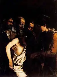 In his short mature career, he produced a handful of intensely emotional tenebrist canvases such as a Jesus among the Masters (Louvre), Jesus and the Tribute money (National Gallery of Scotland), Saint Lawrence distributing alms (painted for San Lorenzo fuori le Mura, now Convent of Valvisciolo in Sermoneta), Decapitation of Saint John the Baptist (San Lorenzo fuori le Mura), Saint Michael (originally San Pietro in Montorio) and Transfiguration of Christ (whereabouts unknown), Road to Emmaus and Sons of Zebedee (Ascona), Portrait of his father (Lugano) and Portrait of a Philosopher (Rancate).