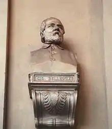 His first main work as: La scrittrice, also known as the Leggitrice del Magni, which was donated to the Brera. His Columbus Messenger was awarded a prize at the 1876 Exposition of Philadelphia. He won a national contest to sculpt a bust of Mazzini once found in Campidoglio. His statue of Un colpo sicuro was sold at the 1878 Paris Exposition. Among his other notable works, are the larger than life busts of Amilcare Ponchielli and Victor Hugo (stucco, 1886 Exhibition of Fine Arts in Milan). He won a gold medal with honorable diploma at the Didactic and Industrial Exposition of Monza, and the extraordinary award outside of the contest at the Exposition regionale of Pavia. In this time, he was nominated, by contest, professor of modeling at the scuola superiore d'arte applicata all'industria in Milan. At the Exposition of Turin, in 1880, he exhibited seven bas-reliefs in porcelain depicting: six portraits and Conjugal Love, and in the next year at the Exposition of Milan, he exhibited a beautiful work, entitled: Volontario di un anno, a medal depicting the Madonna and Child, and a bust titled: Ingenua, and other two busts in stucco: the first, a Portrait of the Artist, the other a portrait of a Signora. stessa Milan at the Exposition of 1883, where he exhibits: a posthumous Portrait of signor Giacinto Zari (marble bust), by commission for the son Giulio, and another posthumous marble Portrait del signor Gaspare Campori; a marble posthumous bust of Portrait of signor Litigi Provasoli, commissioned by Doctor Pietro Labus and his wife; a bust in stucco depicting: King Vittorio Emanuele II by commission for the City Hall of Castellammare di Stabia. At the 1883 Exhibition of Fine Arts in Rome, he exhibited a porcelain plate depicting a profile of the King Umberto I. In 1884 at Turin, he exhibited un marble bust depicting Senator Antonio Giovanola, a bronze Medallion, and a stucco bust of Farina Mathan. In the 1872 Exhibition of Fine Arts in Milan, he displayed a bas relief depicting a Mater Salvatoris, and a bust in marble of Garibaldi.[1]
