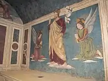 An early painting dated 1456 is an altarpiece entitled Madonna Enthroned and Saints found in Santa Maria delle Grazie, Città di Castello; it is the only work known with certainty to be from his hand.[1] This altarpiece was painted at approximately the same time that Piero della Francesca and his workshop were painting the fresco cycle of The History of the True Cross in the Cappella Maggiore of the church San Francesco, Arezzo. The Città di Castello Madonna displays the influence of Piero but not a detailed knowledge of Piero's cartoons.[3] As an assistant to Piero in Arezzo during the painting of The History of the True Cross cycle, Giovanni is usually credited with painting two scenes: Burial of the Sacred Wood and The Torture of Judas the Jew.[1][4]