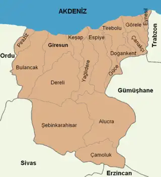Giresun Province (Turkish: Giresun ili) is a province of Turkey on the Black Sea coast. Its adjacent provinces are Trabzon to the east, Gümüşhane to the southeast, Erzincan to the south, Sivas to the southwest, and Ordu to the west. Its area is 6,972 km2,[2] and its population is 450,862 (2022).[1] The provincial capital is Giresun. Its license-plate code is 28.