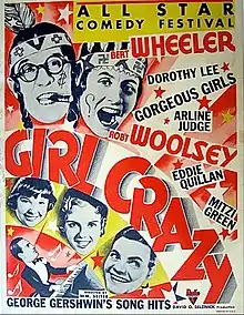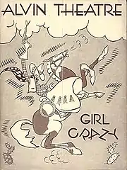 Girl Crazy is a 1930 musical by George Gershwin with lyrics by Ira Gershwin and book by Guy Bolton and John McGowan. Ethel Merman made her stage debut in the first production and co-lead Ginger Rogers became an overnight star. Rich in song, it follows the story of Danny Churchill who has been sent to fictional Custerville, Arizona, to manage his family's ranch. His father wants him there to focus on matters more serious than alcohol and women but Danny turns the place into a dude ranch, importing showgirls from Broadway and hiring Kate Forthergill (Merman's role) as entertainer. Visitors come from both coasts and Danny falls in love with the local postmistress, Molly Gray (Rogers' role).