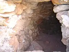 Giren are huts constructed out of undressed dry stone, and they were usually built out of loose pieces of coralline limestone,[7] which were either obtained through quarrying[8] or through clearing loose stones from a piece of land in order to allow for it to be cultivated.[6] The walls are usually around 90 cm (35 in) thick,[7] and they consist of two skins of stone with a rubble infill known as mazkan in between.[5] The roof of the girna is constructed using corbelling, with each row of stones jutting out slightly from the row below it, gradually reducing the size of the opening until flat stone slabs can be used to span it. This results in a dome-shaped concave ceiling,[7] bearing similarities to ancient beehive tombs.[3] Gravel and torba were usually used to cover the roof,[2] while sometimes a pebble-like material called ċagħqija was used for this purpose.[7]