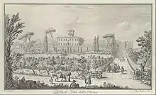 Example of an engraving (page 33) in the book produced by Giuseppe, titled Vedute delle ville, e d'altri luoghi della Toscana, this engraving by Zocchi was based on a depiction by Filippo Morghen.