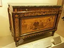 Maggiolini's characteristic furniture consists of commodes and chests, coffers and writing-desks and tables, inlaid with a wide variety[3] of European woods and exotic woods imported from abroad, used in their natural colors or tinted green, like blue or rose. Cartoons for execution in marquetry were provided by artists such as Levati and Appiani, and panels of pictorial marquetry were produced purely for displays as tours de force.