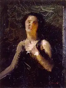 In 1921 Palanti joined the Chiaro di Luna artistic and literary movement, working against the 'antics' of the avant-gardes.[1] In 1923 he was appointed holder of the chair of decoration of the High School of the Brera Academy. In 1924 In the post war period, he began to produce prolific work for private clients amongst the Milanese bourgeoisie looking for portraiture, and occupied a role few contemporaries were offering.[11] His clients included, amongst others, Mata Hari[11] and Grazia Deledda. In 1924 he was commissioned by the Apostolic Nunciature to Argentina to paint a portrait of Pius XI.[6] In 1925 he painted Vittorio Emanuele III and Queen Elena.[1] In 1928 he painted a portrait of Benito Mussolini, which became one of the official images of il Duce, reproduced in newspapers and in the Encyclopedia Treccani. It remains to date one of the official portraits. In 1933 he became a member of the Higher Council of National Education (Ministero dell'Educazione Nazionale), who in 1934 appointed him vice president of the Brera Academy. In the 1940s he participated with his son, the architect Giancarlo Palanti, in the furnishing of the Villa Necchi at the Portalupa, painting numerous paintings including a portrait of Lina Ferrari Necchi measuring 294 cm x 400 cm.[12] His career continued successfully until the early 1940s when WW2 impacted his ability to work. He died in 1946 in Milan at the age of 64, having last exhibited at La Società Patriottica. He is buried in the Monumental Cemetery of Milan (Cimitero Monumentale di Milano).
