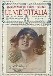 Born in Milan to Giovanni Palanti, a carpenter and furniture maker and Virginia De Gaspari, a seamstress,[1] of Cremonese descent,[2] Palanti was orphaned at a young age. Although he completed elementary and technical schools, he is soon forced to find a job, and by 1895 finds employment drawing sketches for the Milanese fabric company, Scotti.[1][3] At fifteen, he simultaneously enrolled in evening courses at both the Scuola Superiore d'Arte Applicata all'Industria (Higher School of Applied Arts in Industry), where he studied under Luigi Cavenaghi,[4] and the Scuola degli Artefici dell'Accademia di Brera (School of Craftsmen of the Brera Academy). He also sought work as a decorator and poster designer, looking to apply his art practically. In 1898, he enrolled in the painting course at the Brera Academy, taught by Bignami, Mentessi, Pogliaghi and Tallone.[4] In 1899, while still a student, he won a competition to design the cover of the Milanese magazine La Promessa, and posters for the Esposizione Floricola di Monza (Monza Flower Exhibition). In 1900, he won the Zogheb competition for best student of the School of Applied Art.[1] Consequently, was awarded a study trip by the Ministry of Agriculture and Commerce which sent him to Paris to follow the Exposition Universelle, an experience that would influence his style, notably the exhibition pavilions and their advertising billboards.[3] He wrote a detailed account of his interest in poster design, especially the floral work of Alphonse Mucha,[4] and in the technical solutions of art applied to this industry. On graduating in 1901, he was invited by Cavenaghi[1] to teach advanced composition at the School of Applied Art (corso Superiore di composizione) at the Brera Academy, which he would continue to do for ten years.