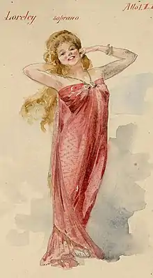 Palanti continued to design and illustrate the covers of sales catalogues for Milanese department stores from 1901 to 1912, working for the Italian Cooperative Union. From 1902, he began working with the Teatro alla Scala as a costume and set designer, as well as designing advertising posters until 1916.[1] His work included among other things design for the first performance of Madame Butterfly by Giacomo Puccini in 1904.[5] He also provided set and costume design for the 1905–06 opera season including The Marriage of Figaro and the La Dama di Picche; Simon Boccanegra in 1910–11, Romeo and Juliet and L'Armida; Don Carlos in 1912; Oberon in 1913; and La Battaglia di Legnano in 1916. He produced notable posters for performances of La fanciulla del West (1911), Isabeau (1912), and Parsifal (1914).[1] In 1907 he became adjunct professor at the Academy's School of Ornament and at the Higher School of Applied Art to Industry (Scuola superiore d'Arte Applicata all'Industria) and from 1913 he replaced Ludovico Pogliaghi in the special decoration school at the Brera Academy. In 1902, he collaborated with the architect Gaetano Moretti to design furniture which was presented in Turin, and later in 1907 his work was used to decorate the Palazzo di Giustizia.[6] In 1906, he was asked to design a series of postcards for the Milan International World Fair.[7] He would go on to participate in both the Centennial International Exposition in Buenos Aires, decorating the façade of the Italian pavilion, and the Brussels International Exposition decorating the ceiling the Italian pavilion in 1910.